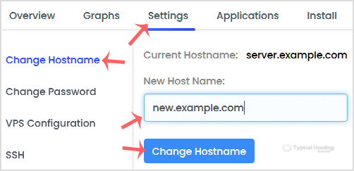4. Click on the Settings tab, and under the Change Hostname option, enter your new hostname. Then click Change Hostname.